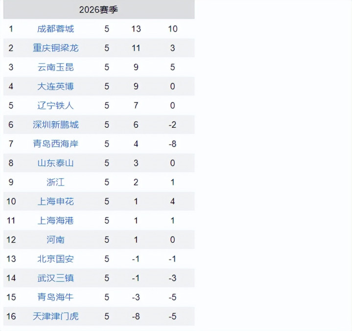 成都蓉城、重庆铜梁龙、云南玉昆排名前三,大连英博、辽宁铁人分列四、五名,此外,上海申花1-0上海海港,积分成功转正,北京国安此役输球后,依然积负1分,青岛海牛负3分,排名倒数第2,天津津门虎以负8分排名垫底。